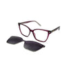 Gafa graduada woman con clip solar en acetato. La montura en plancha morada. El frente es morado transparente. Los laterales en morado.